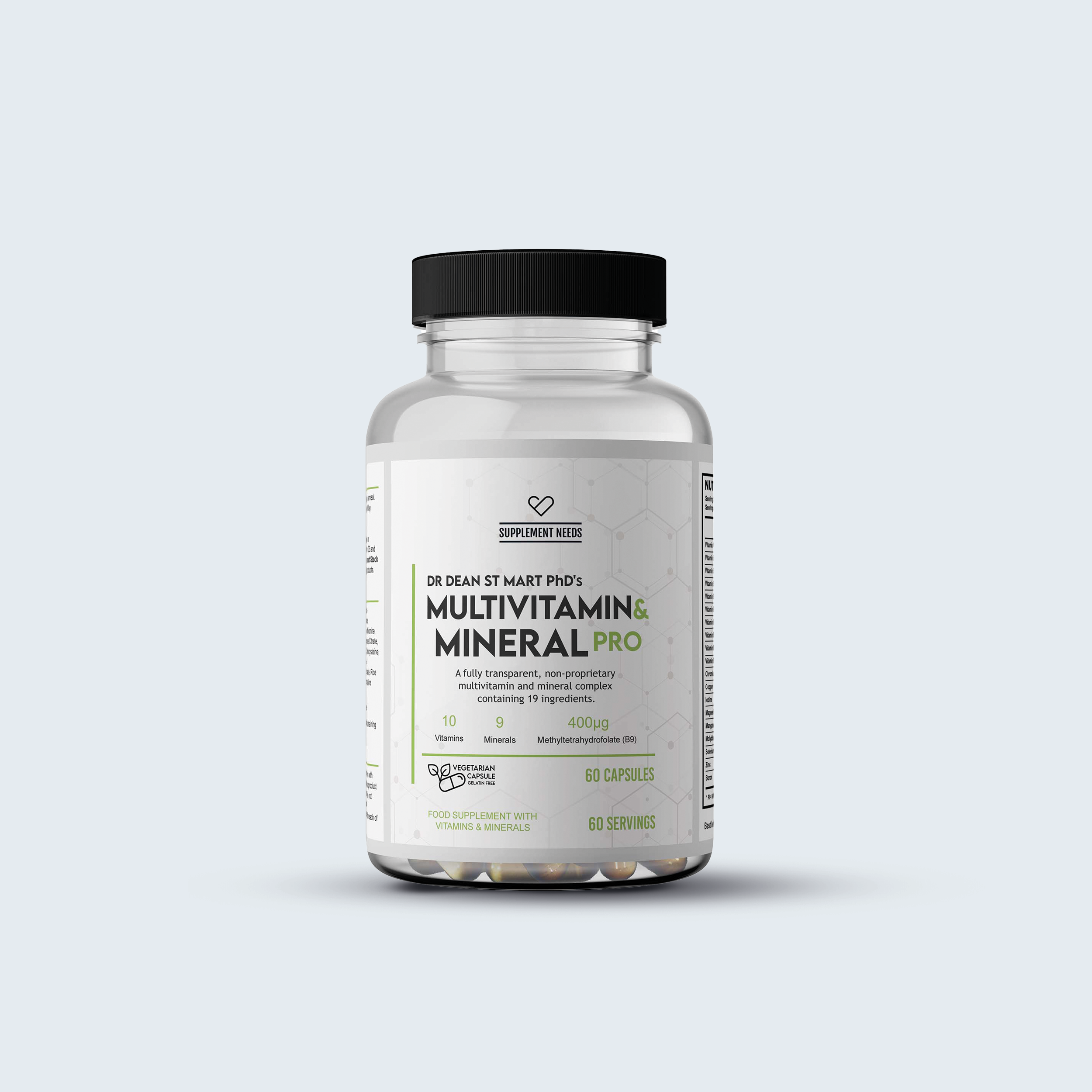 Supplement Needs Multi Vitamin and Mineral Pro is een volledig transparant, niet-propriëtair supplement met 19 actieve ingrediënten, waaronder 10 vitamines en 9 mineralen. Geformuleerd door Dr. Dean St Mart PhD, bevat het onder andere vitamine A (Retinyl Palmitate), acht B-vitamines (B1, B2, B3, B5, B6, B7, B9, B12) en vitamine E (alpha-tocopherol). De mineralen omvatten Chromium, Copper, Iodine, Magnesium, Manganese, Molybdenum, Selenium, Zinc en Boron.